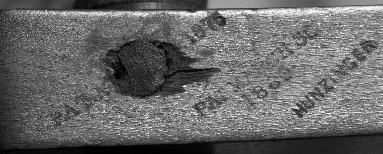 Impressed into proper left rear leg at rear, on diagonal, just behind seat: "PAT. A [loss where dowel has been repaired] 1876 / PAT. MARCH 30 / 1869 / HUNZINGER."