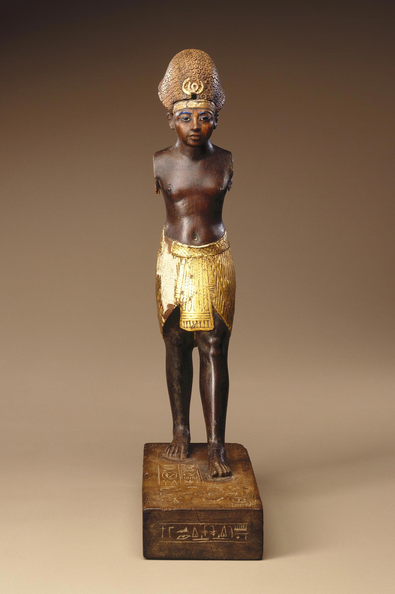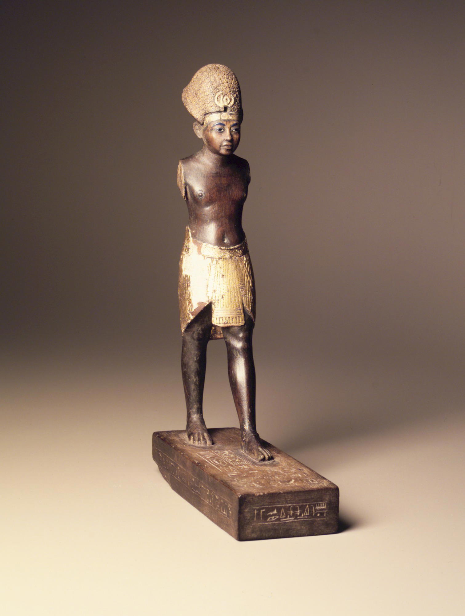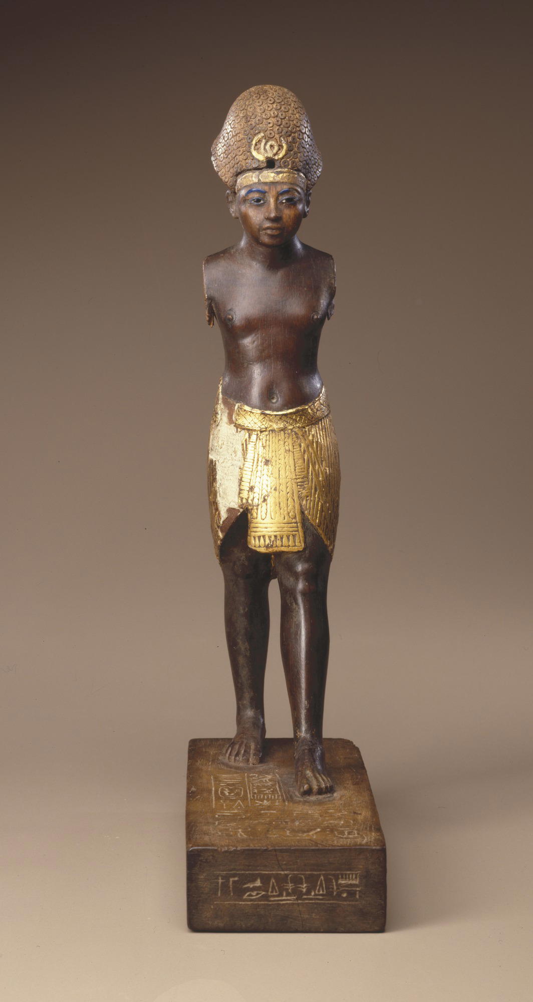 Amunhotep III, ca. 1390–1352 B.C.E.. Wood, gold leaf, glass, pigment, Total height: 10 3/8 in. (26.3 cm) Base: 6 5/16 x 1 1/16 x 2 3/8 in. (16 x 2.7 x 6 cm). Brooklyn Museum, Charles Edwin Wilbour Fund, 48.28. Creative Commons-BY (Photo: Brooklyn Museum, 48.28_front_PS4.jpg)