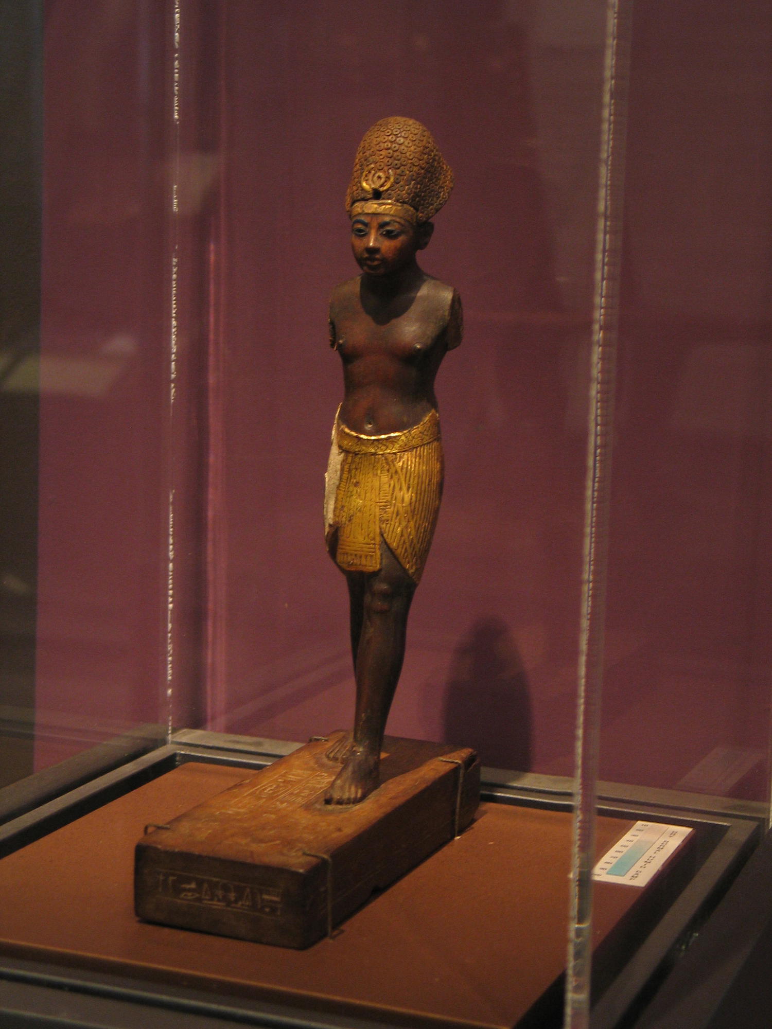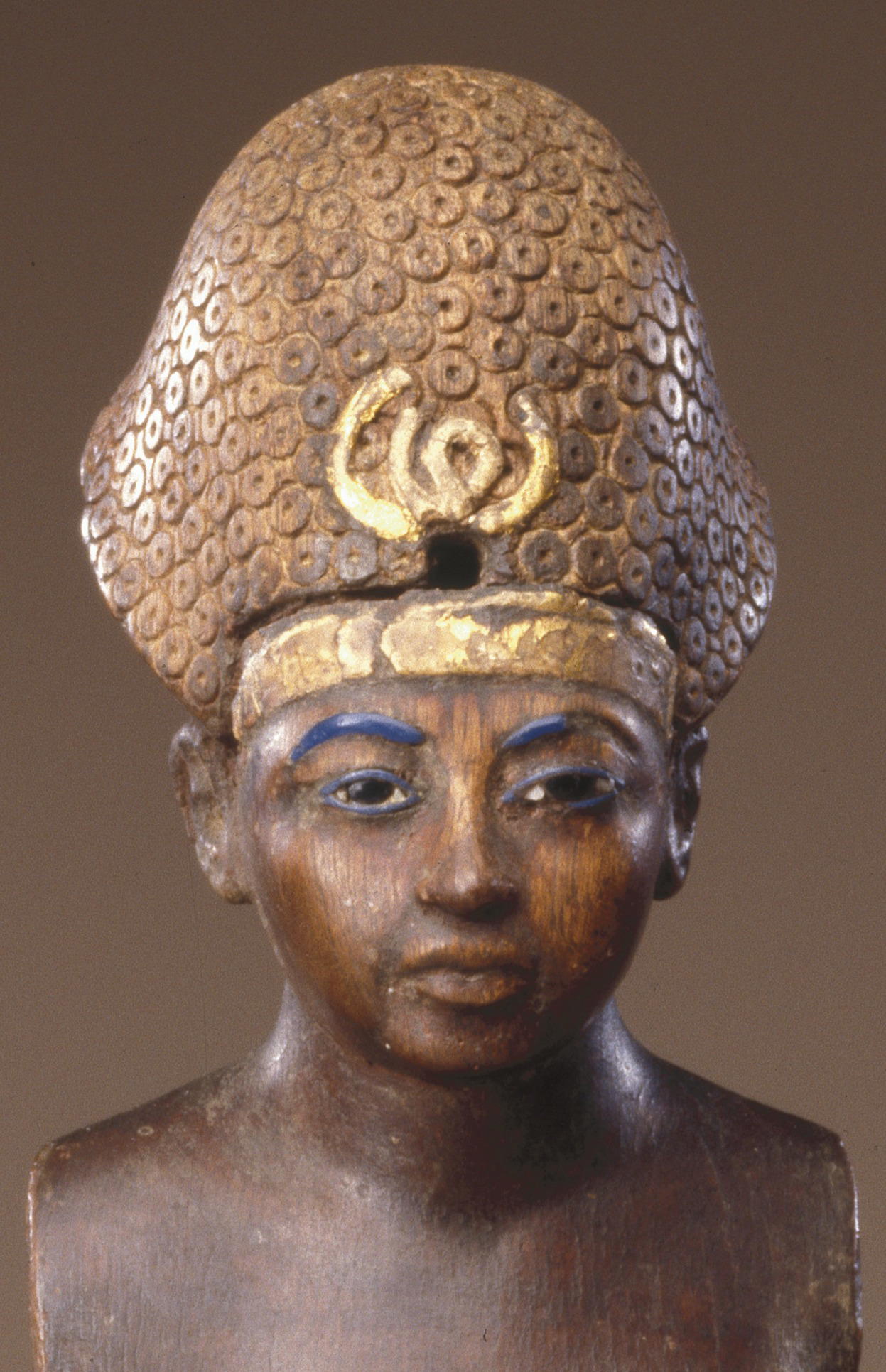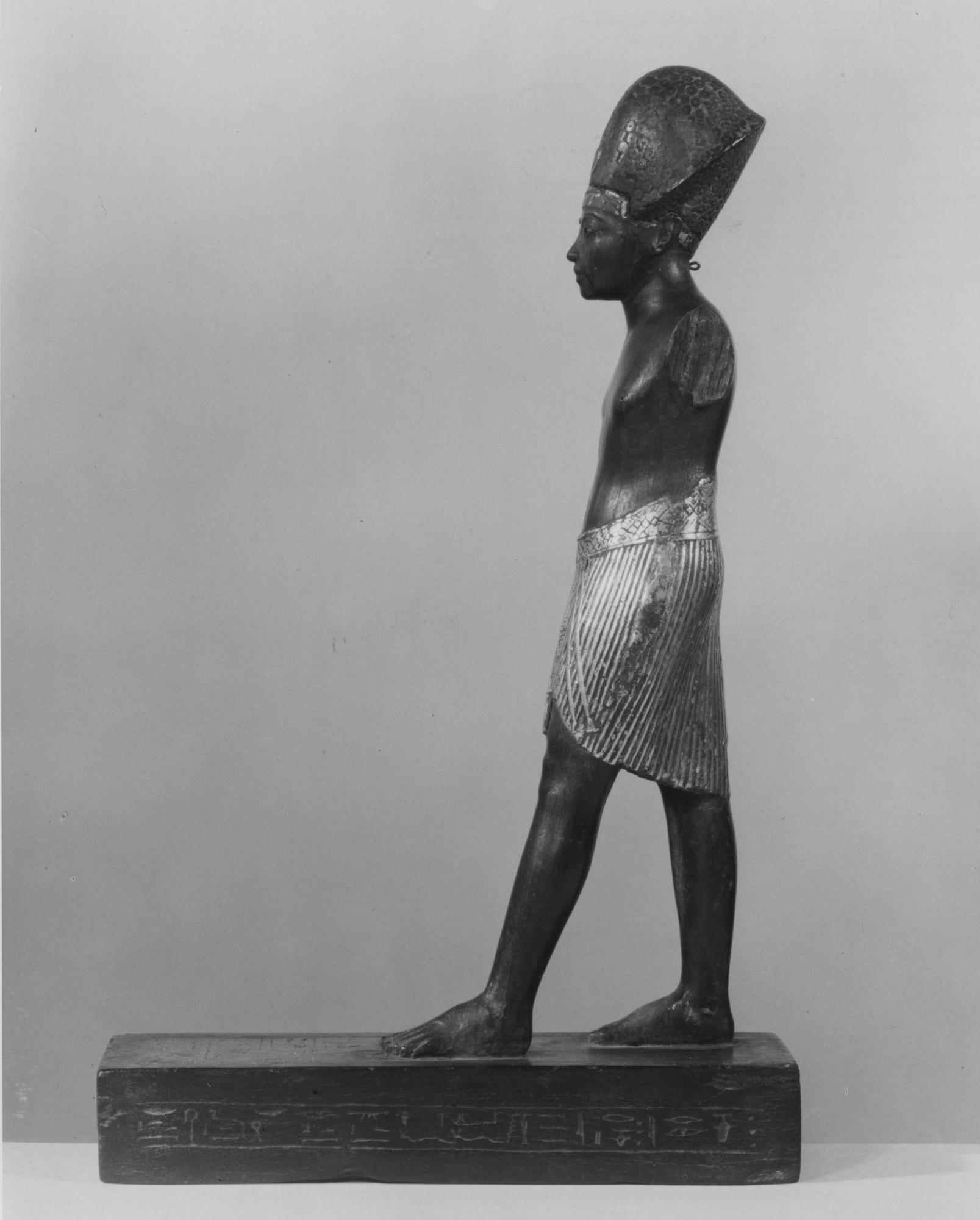 Amunhotep III, ca. 1390–1352 B.C.E.. Wood, gold leaf, glass, pigment, Total height: 10 3/8 in. (26.3 cm) Base: 6 5/16 x 1 1/16 x 2 3/8 in. (16 x 2.7 x 6 cm). Brooklyn Museum, Charles Edwin Wilbour Fund, 48.28. Creative Commons-BY (Photo: Brooklyn Museum, 48.28_front_PS4.jpg)