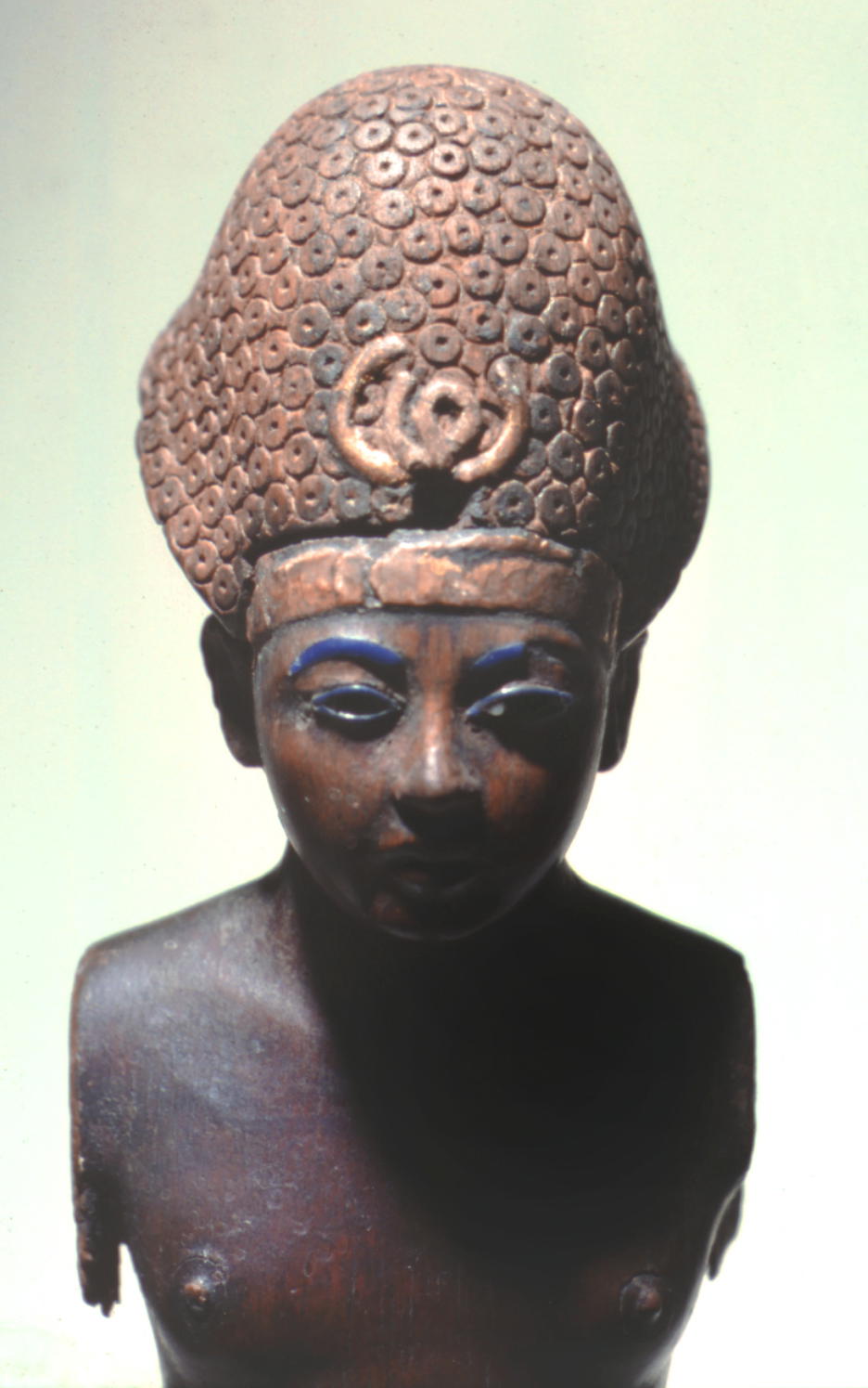 This is such an amazing statue of the pharaoh Amunhotep III. His reign was a time of peace and grandeur. It is made of wood, which was quite an expensive material in ancient Egypt.Wood rarely survives from antiquity, though we have some from Ancient Egypt thanks to the climate, it's very dry.It doesn't seem very blue to me. Why is it called the blue crown?