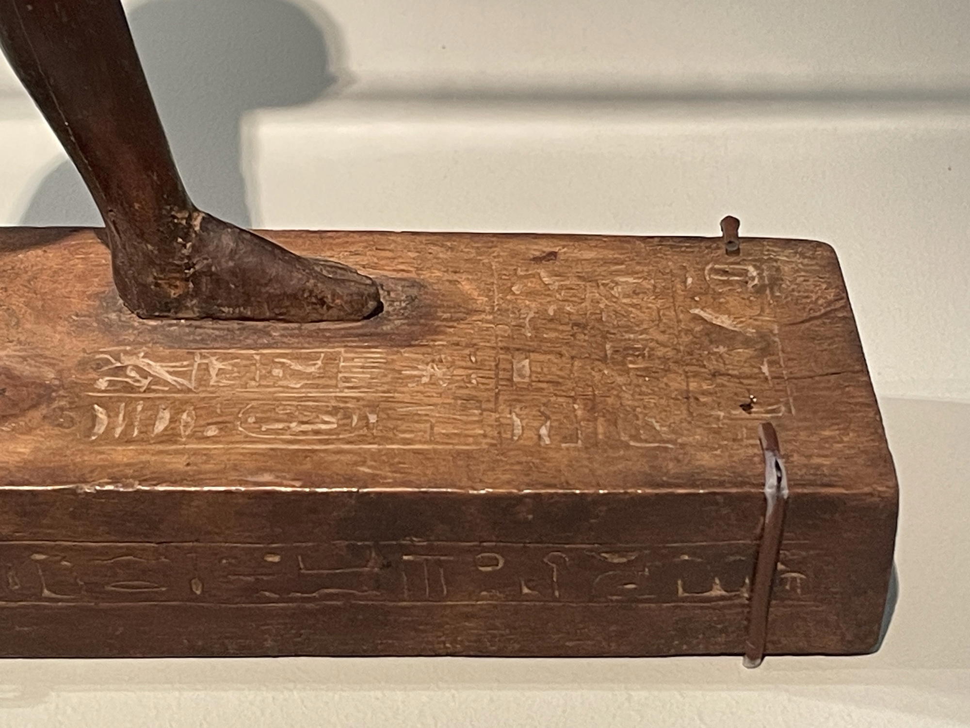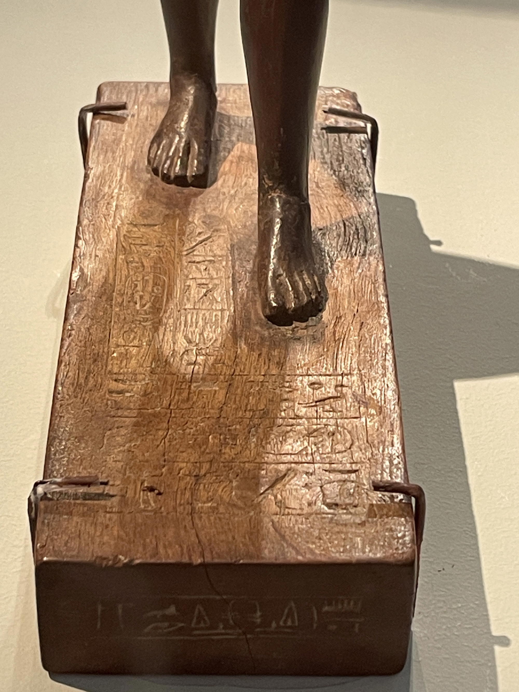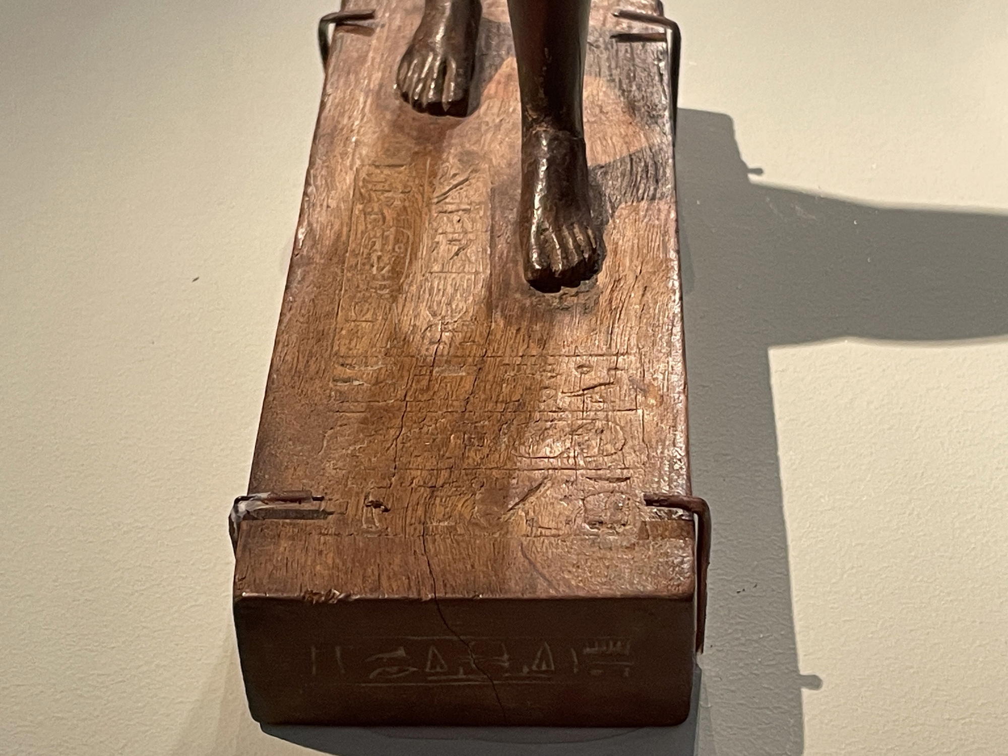 That is a New Kingdom sculpture of the king Amunhotep III. It is special because it is made of wood. Generally speaking wood was pretty expensive and rare. Given Egypt's climate most wood was imported. Wood rarely survives from antiquity, though we have some from Ancient Egypt thanks, again, to the climate.Is there a particular reason why this object was used for the signage of the Egyptian Galleries?