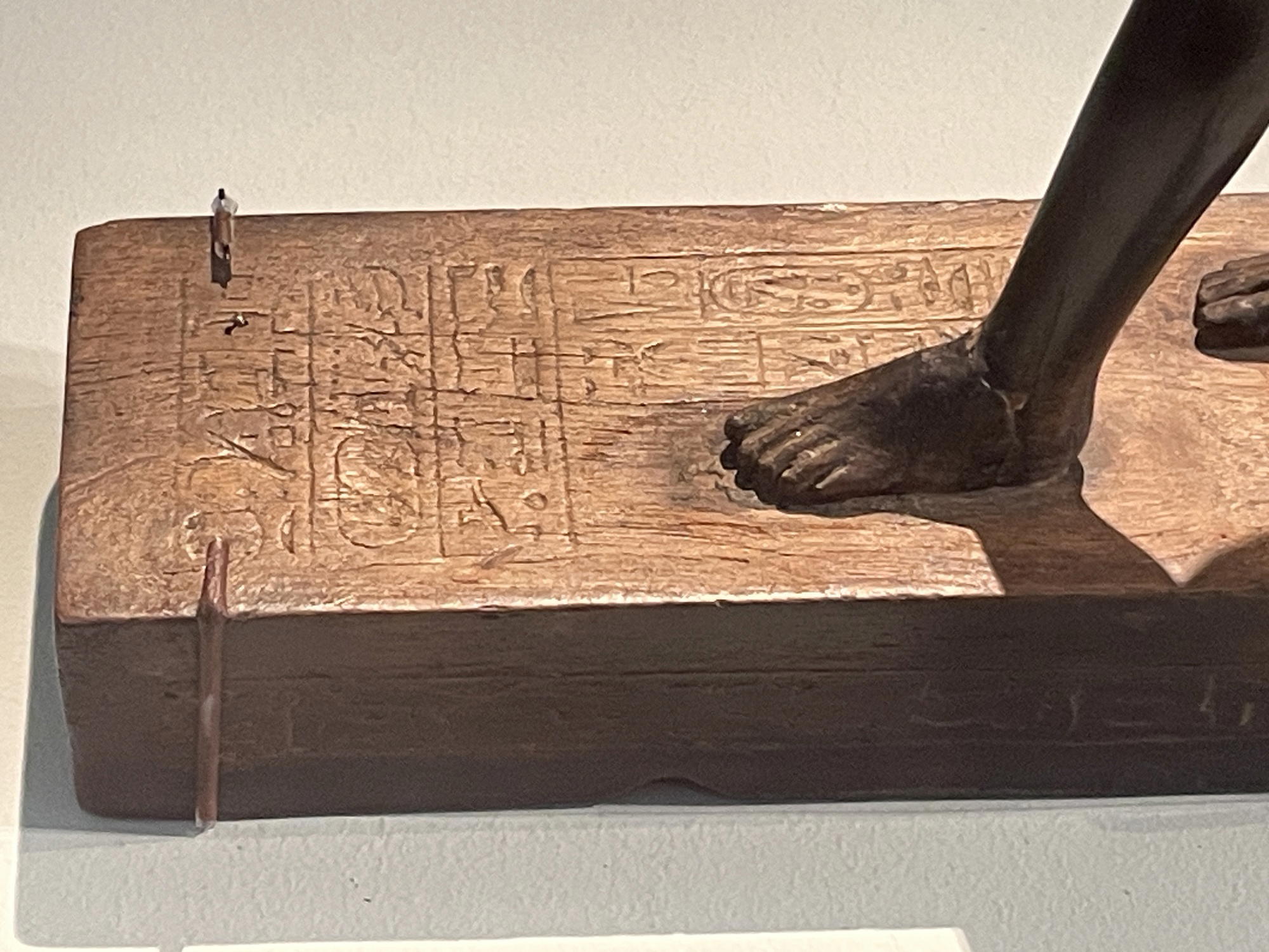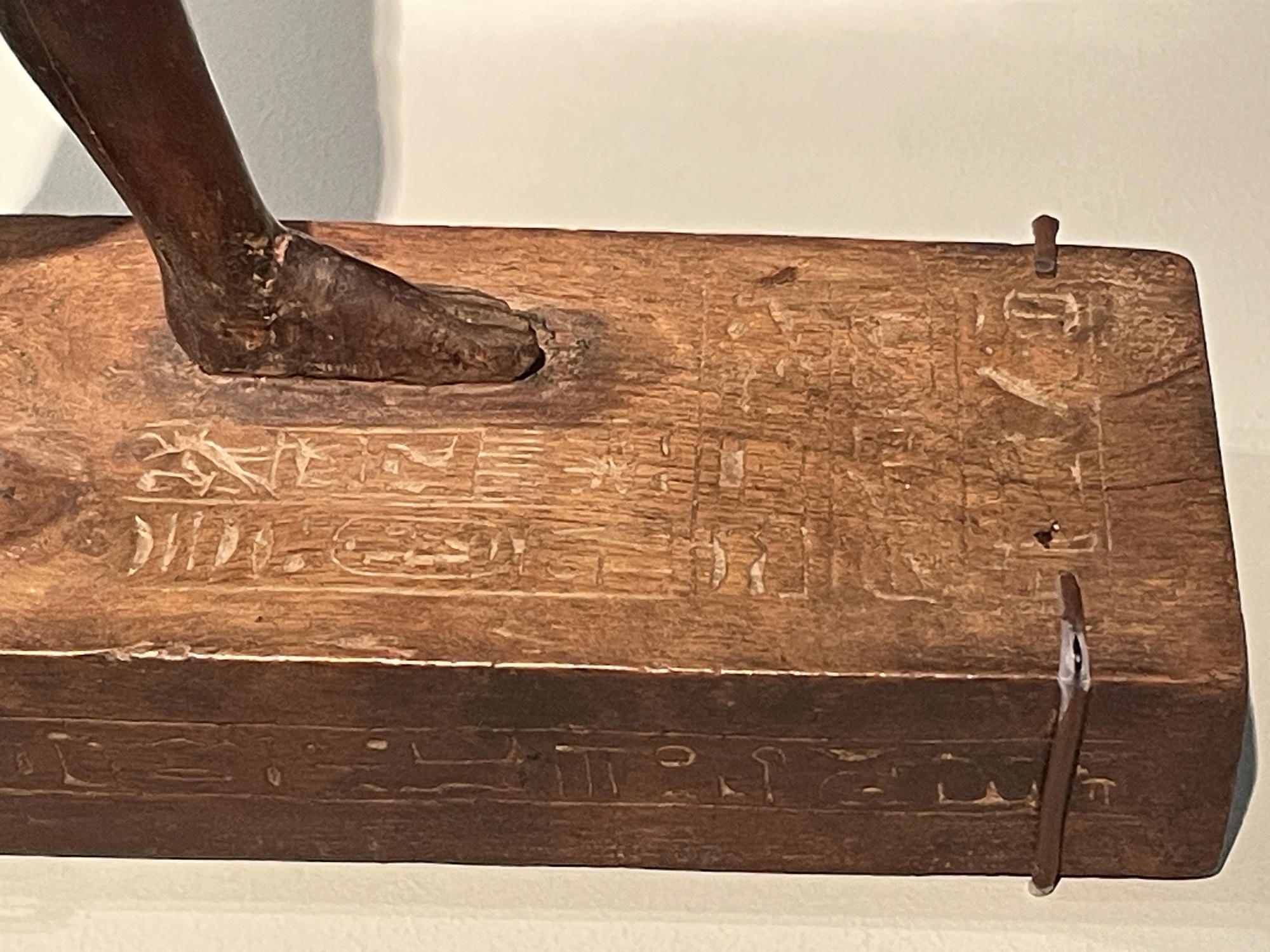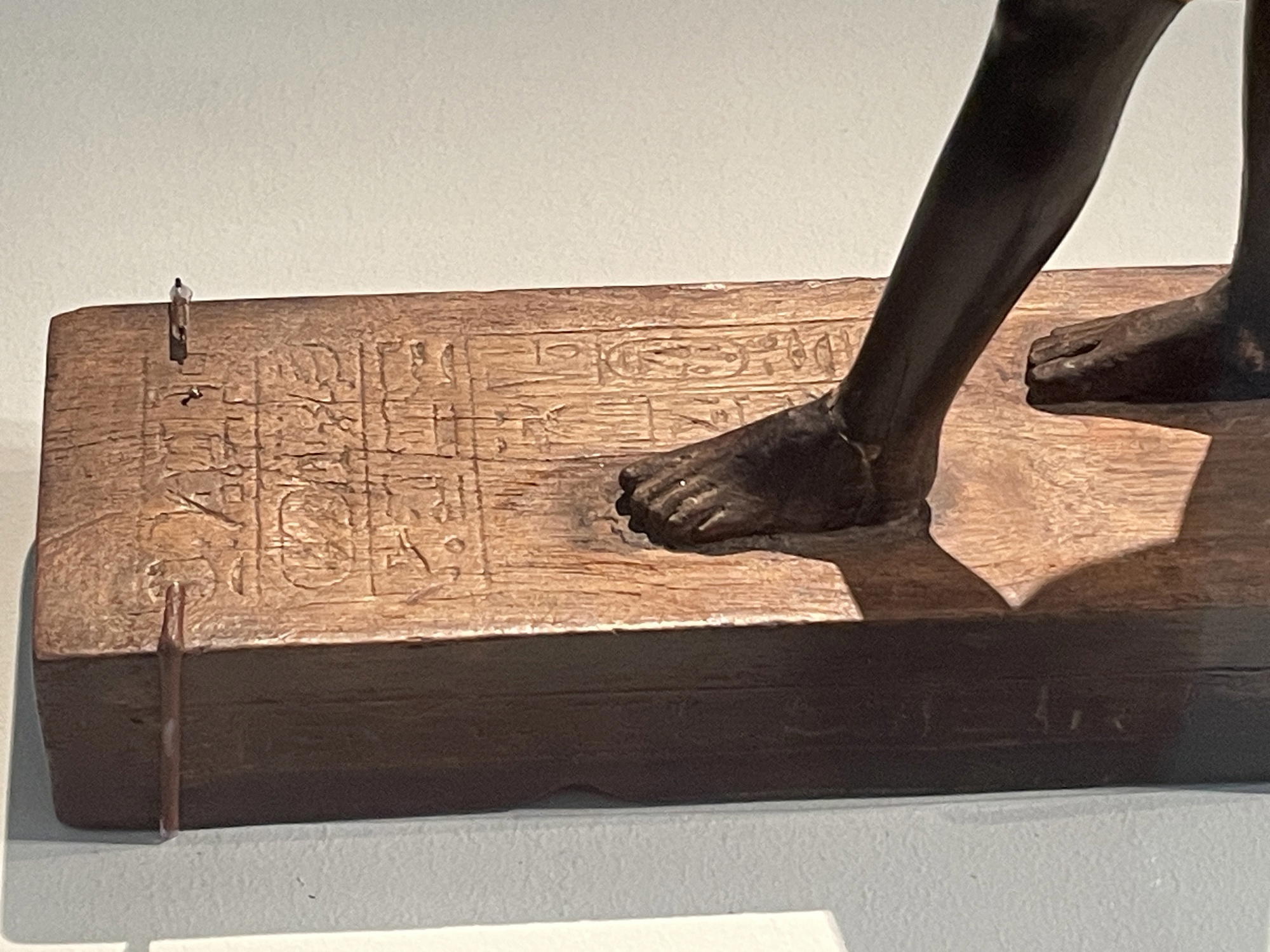 That is a New Kingdom sculpture of the king Amunhotep III. It is special because it is made of wood. Generally speaking wood was pretty expensive and rare. Given Egypt's climate most wood was imported. Wood rarely survives from antiquity, though we have some from Ancient Egypt thanks, again, to the climate.Is there a particular reason why this object was used for the signage of the Egyptian Galleries?