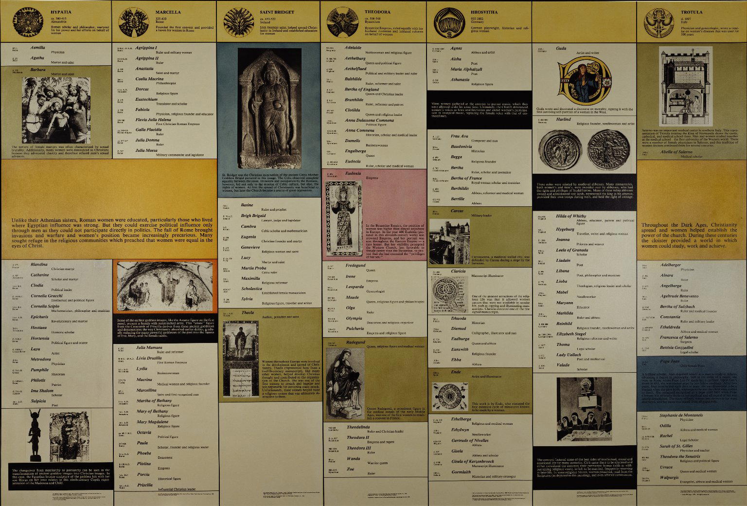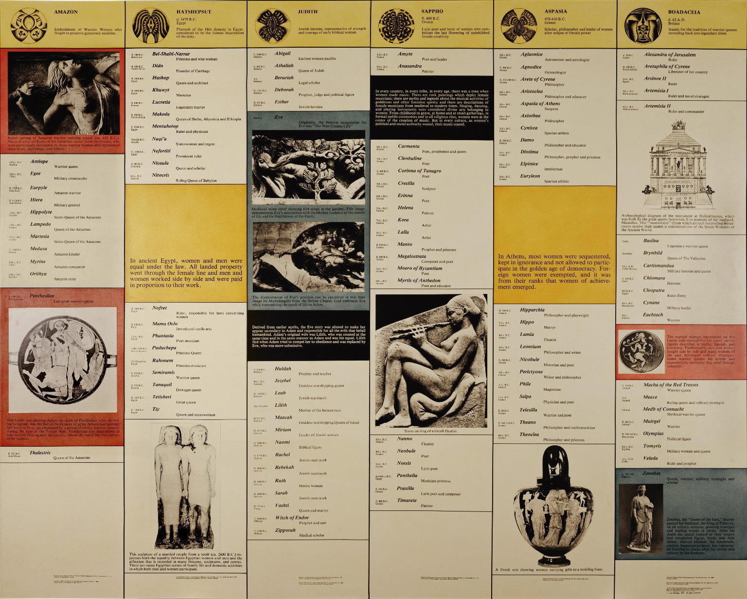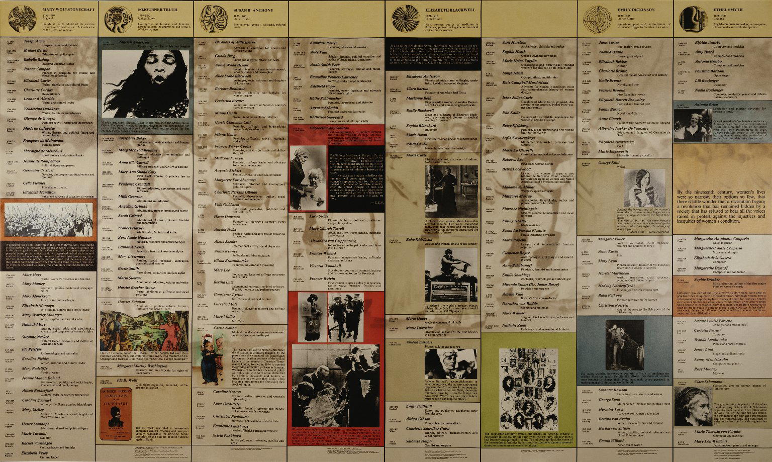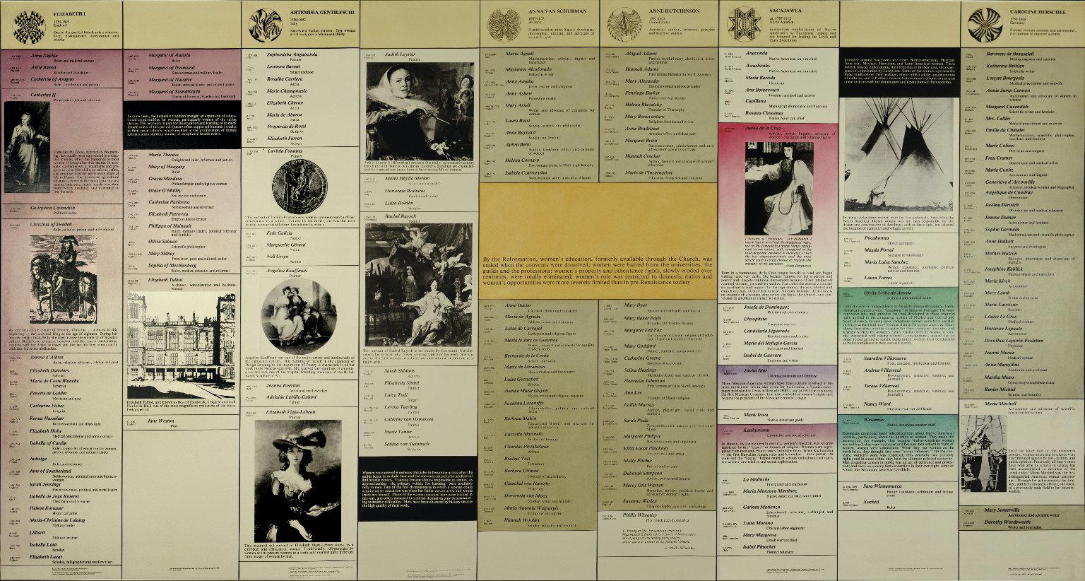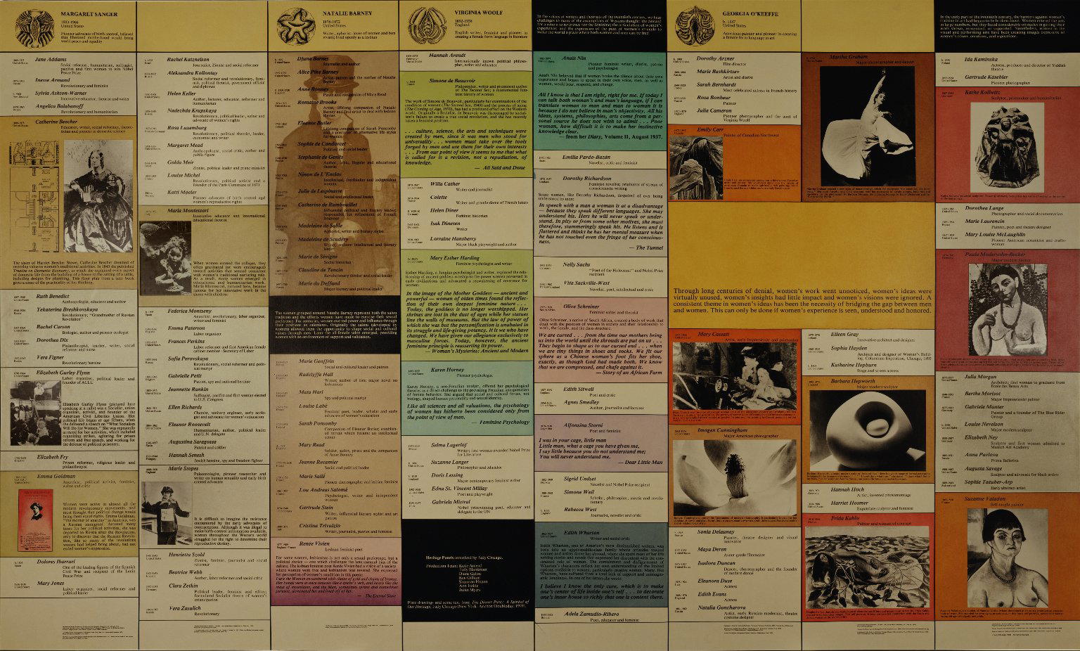 Yes! It begins at the corner with the ancient goddesses and runs chronologically to the 20th century. Chicago describes the breakdown of each of the three wings like this: First, prehistory and ancient goddess worship through Classical Rome ending in the early days of Christianity. Next, the rise of widespread Christianity and the last days of Rome through to the Reformation. Last, the Enlightenment into the twentieth century with an emphasis on the early seeds of the feminist movement. The increase in dimensionality of the plates is a reference to women’s visibility and level of participation in society over time.
