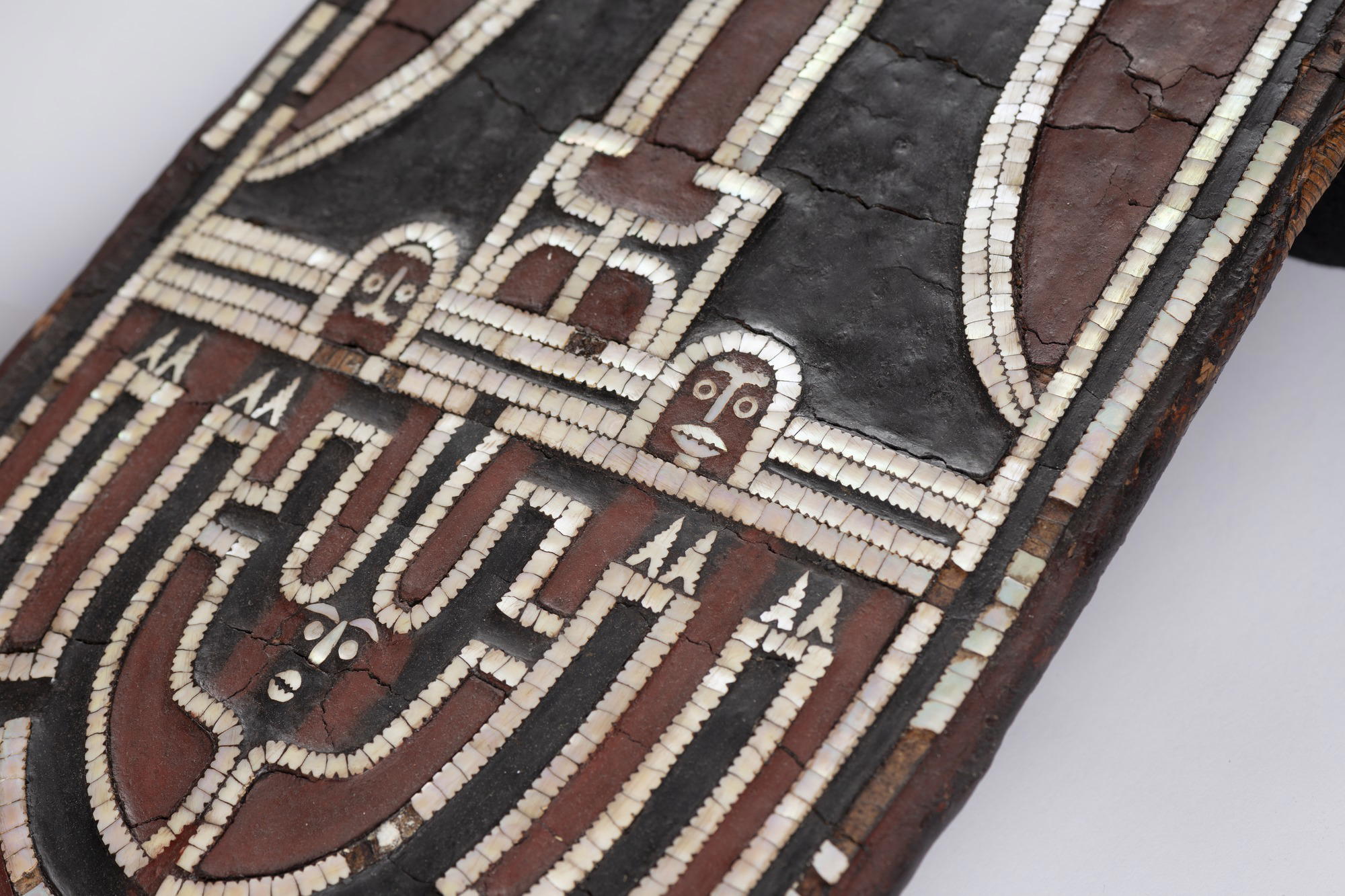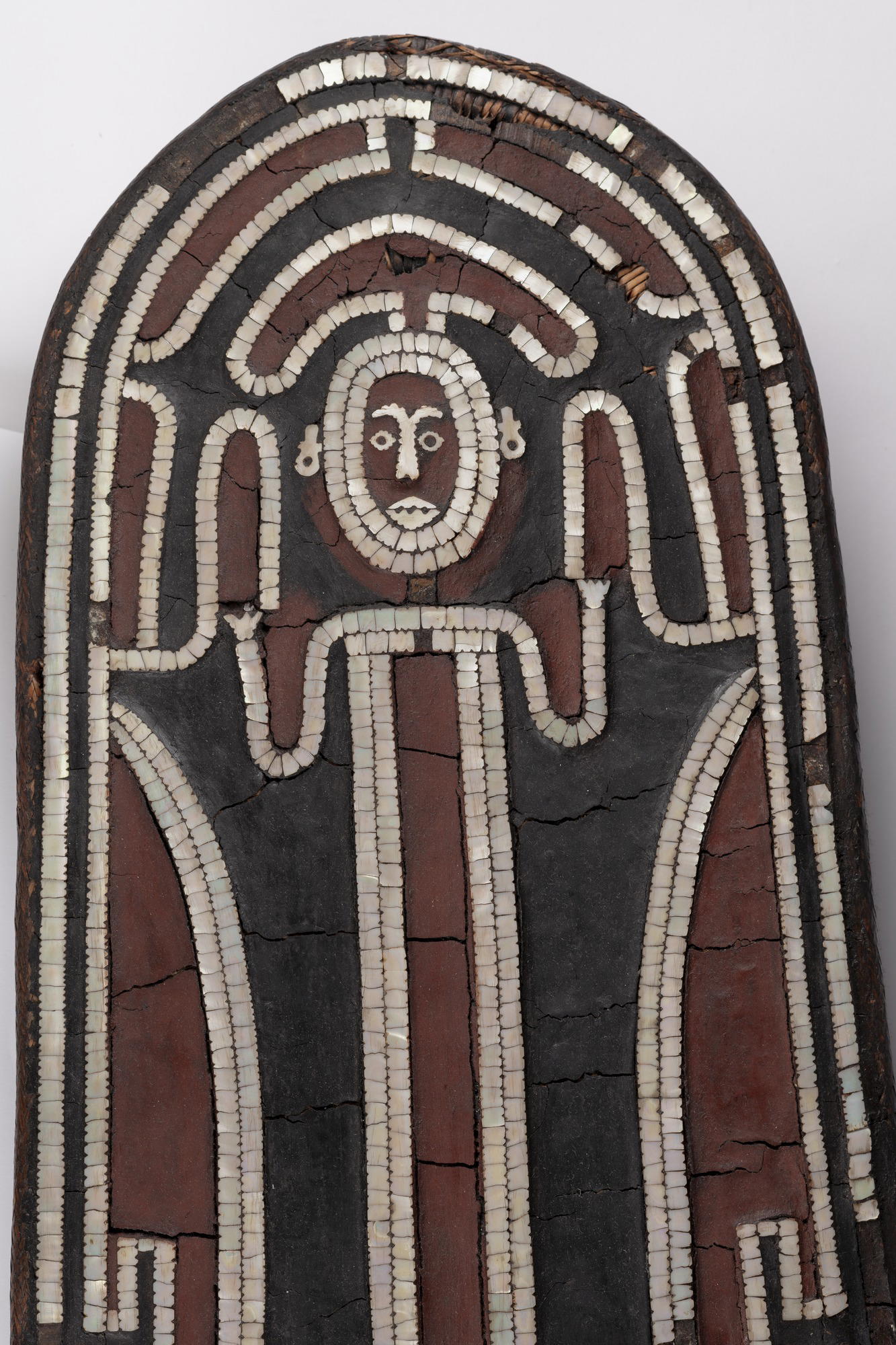The unparalleled virtuosity of the Solomon Islanders in the art of shell inlay is clearly demonstrated by this rare and richly embellished war shield, collected before 1852 by Surgeon Captain James Booth of the British Royal Navy. Only about twenty of these shields are extant today, and all are believed to have been made before 1840. Shell-inlaid shields were based on the more common elliptical wicker shields made on Guadalcanal and traded to Santa Isabel Islanders, who decorated the shield by covering it with red and black resins and setting in abstract linear designs created with small pieces of nautilus shell. Two detached heads and a face below, as well as a set of four double arrow-like points, distinguish this shield, whose characteristic design format is dominated by an anthropomorphic figure with upraised arms. These shields were too fragile for use and were designed as prestige items.<br />